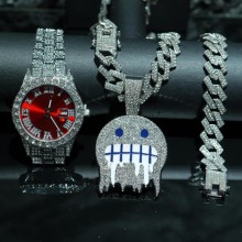 Your Position: Home > Anime category > Other Cartoon > Fashion Hip Hop Rhinestone Wrist Watch Cuban Chain Necklaces Set